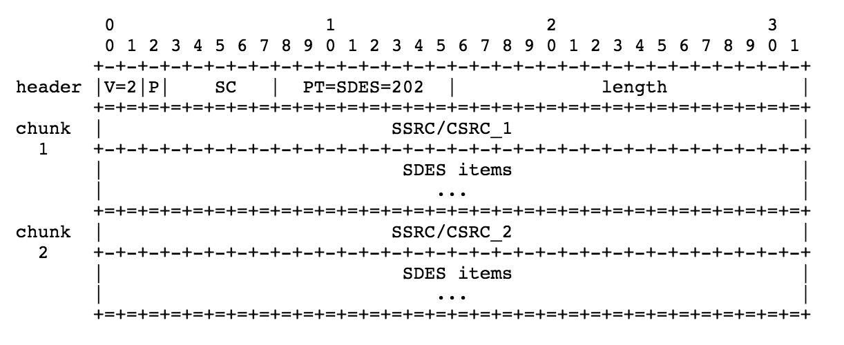 - BYE或APP:其他RTCP包类型(包括协议中还未定义的),可能以任意顺序跟在SDES后面,但是希望BYE包写在最后面(BYE包需要和SSRC/CSRC一同发送)。