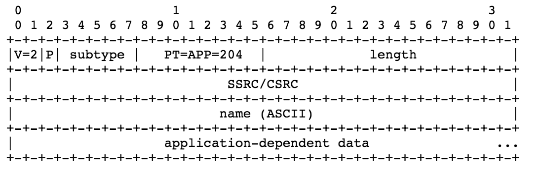 - packet type (PT): 8 bits 204表示APP类型的RTCP报文。