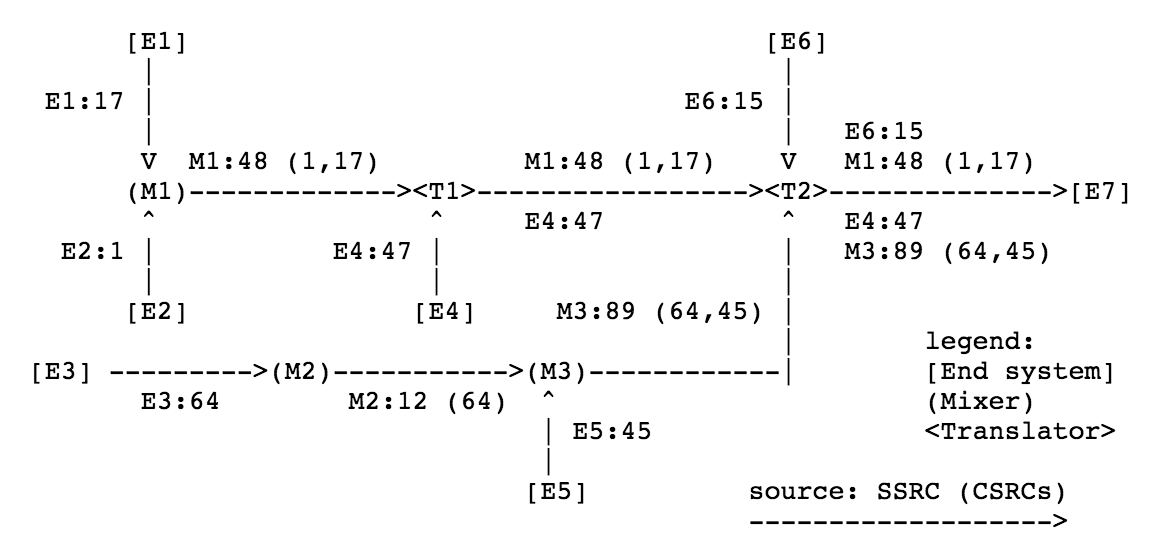 上图是一个Mixers和Translators连接的例子。[]代表末端节点,()代表Mixer,<>代表Translator,"M1:48(1,17)"表示Mixer1的报文,48是Mixer1的SSRC,括号里的1,17是CSRC,它合并了E1:17和E2:1这两个节点的数据。