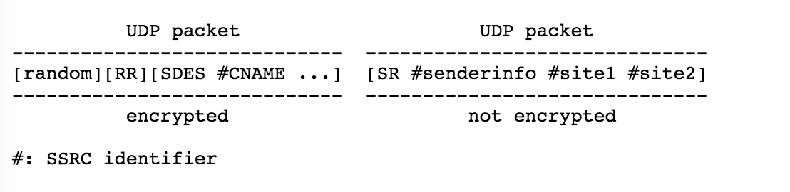 保密性是指我们的报文只希望一些特定的接受者可以解码成明文,而其他人只能得到无用的信息,保密性是通过加密编码来提供的。 当需要为RTP和RTCP报文提供加密服务时,所有传输的内容都会在下层报文那里进行加密。对于RTCP来说,需要一个32-bit的随机数作为前缀。而RTP报文不需要前缀,取而代之的是随机序列号和时间戳偏移。因为随机部分很少,所以可以说这是一个非常弱的初始向量。此外,SSRC也可被破解者修改,这是这个加密方案的另一个薄弱的环节。 对于RTCP来说,可能会将一个复合包分成两批,第一批加密,后一批明文发送。例如,SDES部分的信息可能加密,而接受报告部分不加密就发送出去,因为只有这样那些第三方监控器才能在不知道密钥的情况下统计网络状况。如下图所示,SDES信息必须跟在一个空的RR后,并且要有一个随机前缀。