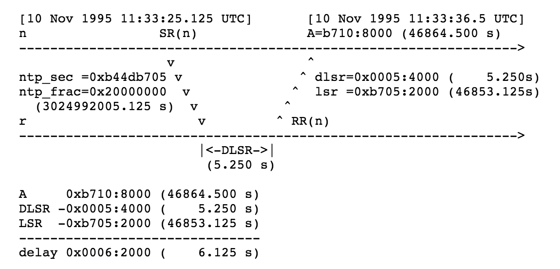 所有的整数字段都使用网络字节序(大端序),除了特别声明,数字常量由十进制表示。 所有头部数据都会根据其数据的原始长度进行对齐,比如,16-bit的数据会对齐到偶数偏移,32-bit的数据会对齐到可被4整除的偏移。此外,用0来作为填充字节。 Wallclock time(绝对日期和时间)是用网络时间协议(NTP)的时间格式来表示,即从1900年一月一日0点到现在的秒数。NTP的时间戳使用了64-bit的无符号固定小数点的形式表示,其中头32-bit用来表示整数部分,后32-bit用来表示小数部分。RTP的时间格式采用了NTP的简化版,他只用了NTP的64-bit数据的中间32-bit,即前16-bit表示整数,后16-bit表示小数。 NTP时间戳到2036年就会循环回0,但是因为RTP只会使用不同NTP时间的差值,所以这不会有什么影响。只要一对时间戳都在同一个循环周期里,直接用模块化的架构相减或者比较就可以,NTP的循环问题就不重要了。