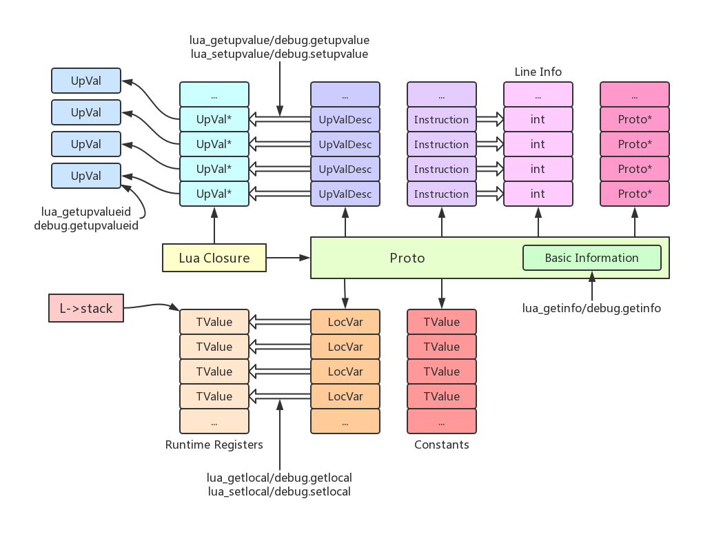 - LClosure->upvals是UpVal结构体指针的数组,每一个槽是一个指向UpVal的指针,每次Lua需要访问其函数的Upvalue,都需要通过对应UpVal的v字段来间接访问
