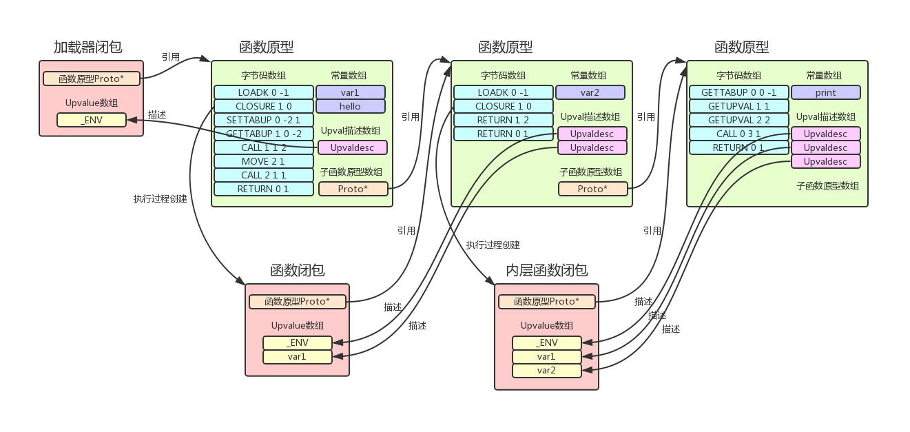 - 函数原型是编译Lua代码的产物,闭包是在执行字节码的过程生成的