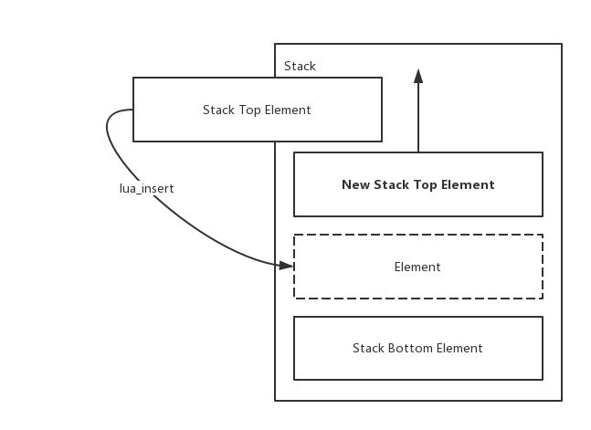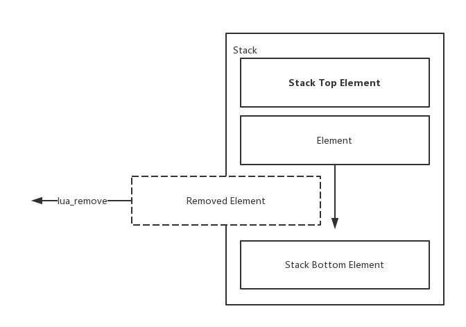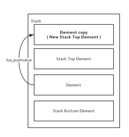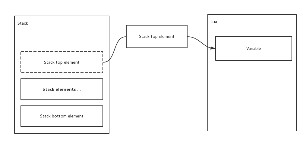 另外一个就是栈的概念,在Lua和C进行交互数据的时候会用到了一个栈的结构,栈中的每个元素都能保存任何类型的Lua值。要获取Lua中的一个值时,需要调用一个C Api函数,Lua就会将特定的值压入栈中,然后再通过相应的C Api将值取出来,如图所示: