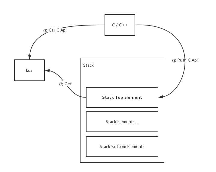 同样,要将一个值传给Lua时,需要先调用C Api将这个值压入栈,然后再调用C Api,Lua就会获取该值并将其从栈中弹出。 如图所示: