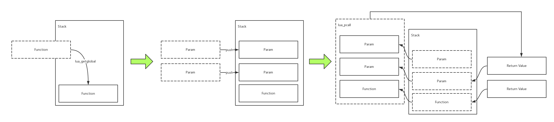 上述代码中的lua_pcall方法表示将栈中的元素视作Function来进行调用。其中第二个参数为传入参数的数量,必须与压栈的参数数量一致;第三个参数为返回值的数量,表示调用后其放入栈中的返回值有多少个。第四个参数是用于发生错误处理时的代码返回。其运行原理如下图所示: