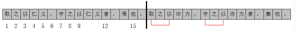 取之以、仁义、,、者、守之以、也、诈力、。均重复出现过,只需指出其之前出现的位置,便可表示这些词。为了指明出现位置,我们定义一个相对位置,如图
