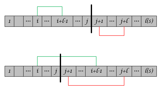 我们称字符串$$S_{j+1,j+l}$$匹配了字符串$$S_{i,i+l-1}$$,且匹配长度为$$l$$。如图所示,存在两类情况: