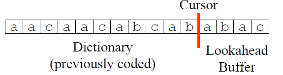 因此,$$p^j = 2$$且最长匹配的长度$$l^j=4$$. 从上面的例子中可以看出:子串$$S_{j+1,j+p}$$是可以由$$S_{1,j}$$生成,因而称之为$$S_{1,j}$$的再生扩展(reproducible extension)。LZ77算法的核心思想便源于此——用历史出现过的字符串做词典,编码未来出现的字符,以达到数据压缩的目的。在具体实现中,用滑动窗口(Sliding Window)字典存储历史字符,Lookahead Buffer存储待压缩的字符,Cursor作为两者之间的分隔,如图所示: