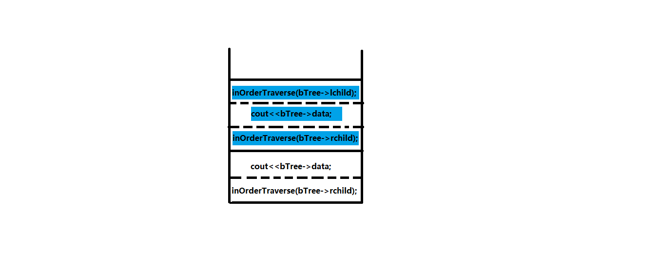 当主函数inOrderTraverse(bTree)中第一个inOrderTraverse(bTree->lchild)子函数被调用时,主函数中剩余的数据和步骤被保留在当前的函数栈帧中。而子函数入函数栈,成为栈顶函数。当子函数运行结束,返回时,子函数出栈,栈顶又变为主函数。然后,程序继续执行主函数中的剩余步骤。