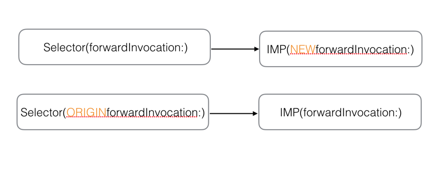 forwardInvocation 函数,在里面执行需要嵌入的附加代码,完成之后,再转回原来的 IMP。