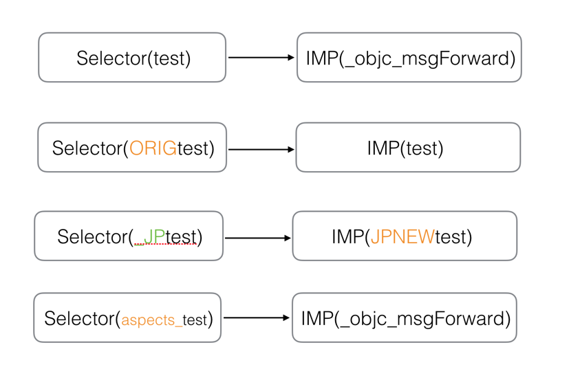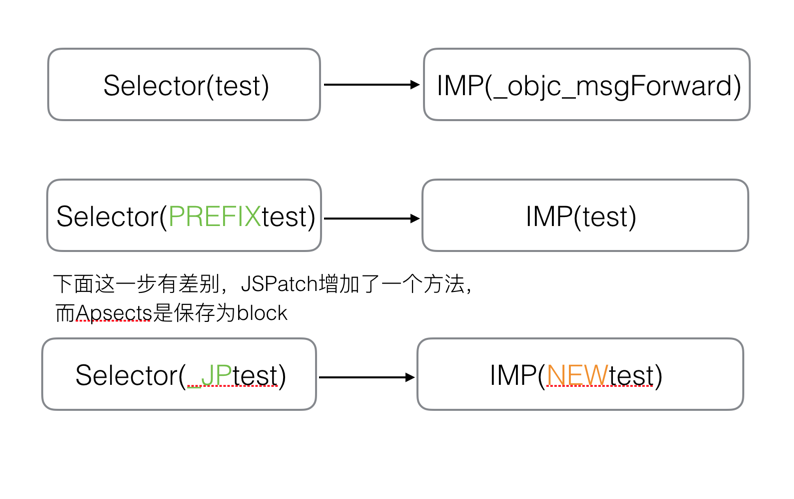 首先执行Before hooks;接着查找是否有Instead hooks,如果有就执行,如果没有就在类继承链中查找父类能否响应-aspects_test,如果可以就invoke这个invocation,否则把respondsToAlias置为NO;接着执行Afterhooks;接着if (!respondsToAlias)把这个-test转发给ORIGINforwardInvocation即IMP(JSPatchforwardInvocation)处理了这个消息。注意这里是把-test转发