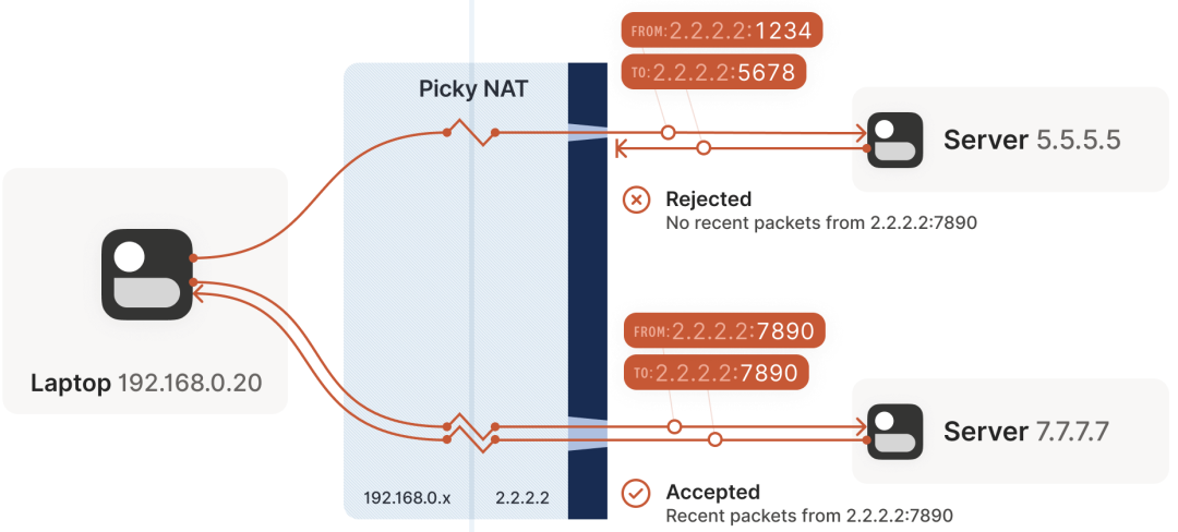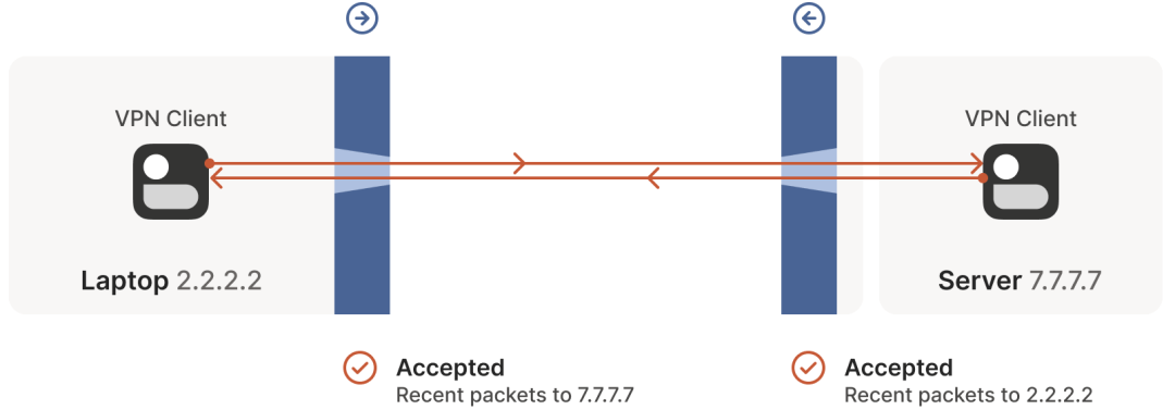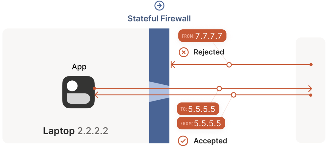 笔记本电脑中自带了一个防火墙,当该防火墙看到从这台机器出去的 2.2.2.2:1234 -> 5.5.5.5:5678包时,就会记录一下:5.5.5.5:5678 -> 2.2.2.2:1234 入向包应该放行。这里的逻辑是:我们信任的世界(即笔记本)想主动与5.5.5.5:5678 通信,因此应该放行(allow)其回包路径。