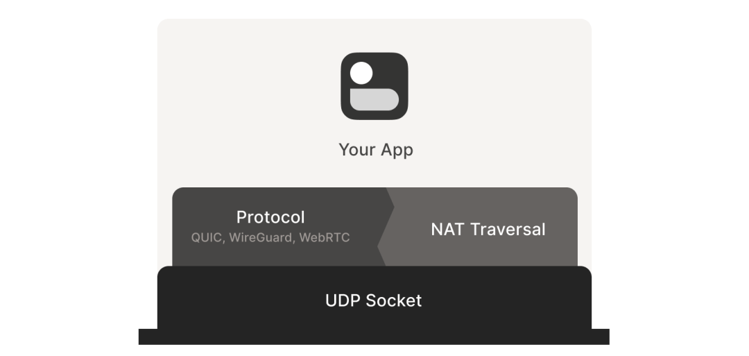 某些协议(例如 WebRTC)将 NAT 穿透与其他部分紧密集成。但如果你在构建自己的协议, 建议将 NAT 穿透作为一个独立实体,与主协议并行运行,二者仅 仅是共享 socket 的关系,如下图所示,这将带来很大帮助: