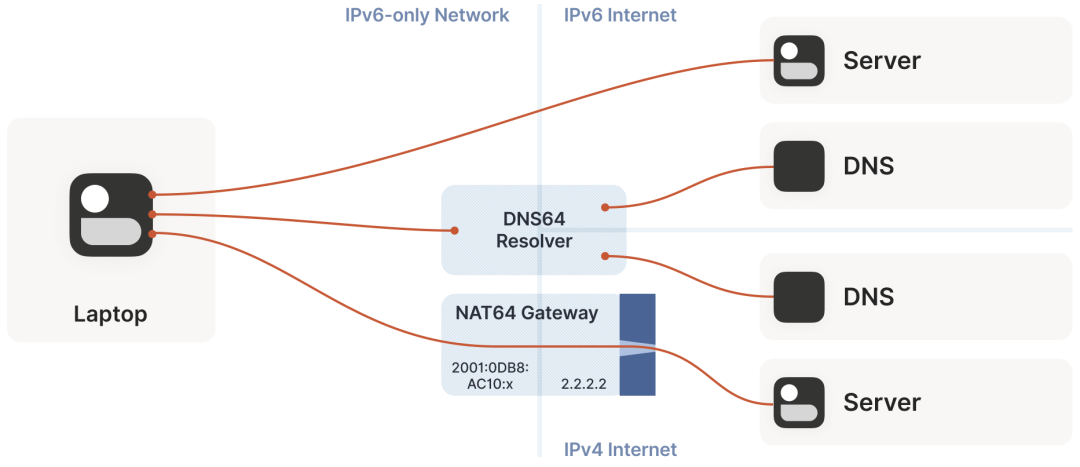 如果需要处理 DNS 问题,那这种方式工作良好。例如,如果连接到 google.com,将这个域名解析成 IP 地址的过程会涉及到 DNS64 设备,它又会进一步 involve NAT64 设备,但后一步对用户来说是无感知的。