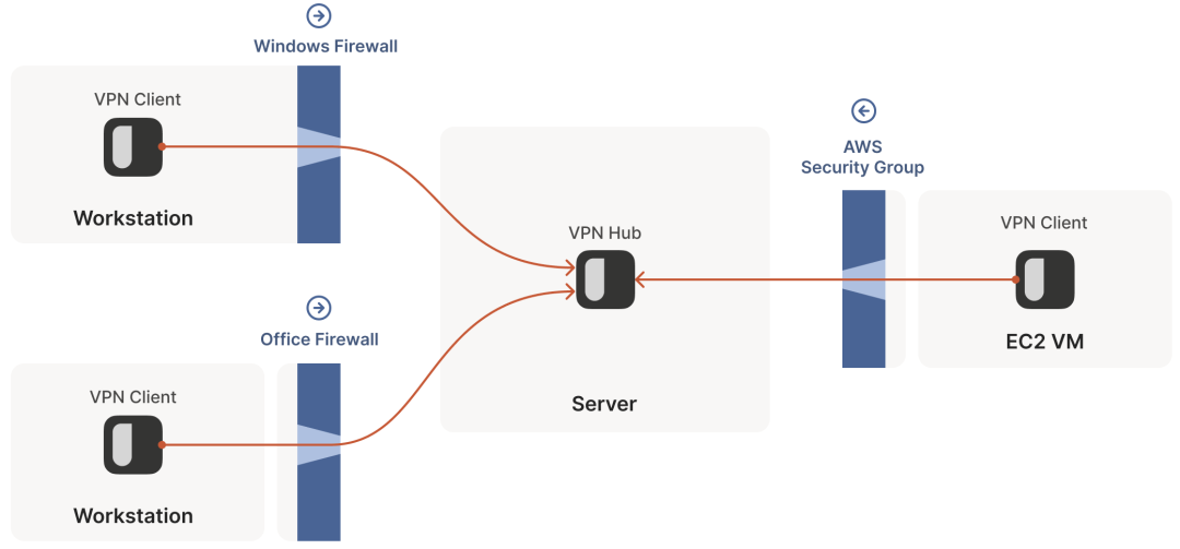 但上图是假设了通信双方中,其中一端(服务端)是能直接访问到的。在 VPN 场景中,这就形成了所谓的 hub-and-spoke拓扑:中心的 hub 没有任何防火墙策略,谁都能访问到;防火墙后面的 spokes 连接到 hub。如下图所示: