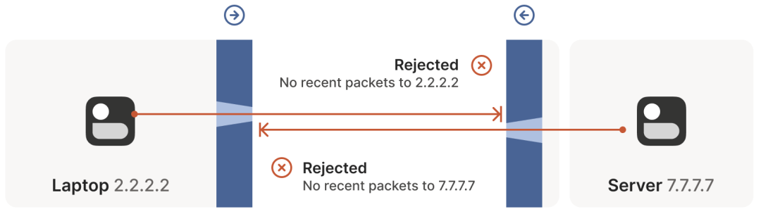 - 注意,这里除了要满足包的 IP 和端口要匹配这一条件之外,并没有要求包必须是相关的(related)。换句话说,只要某些包带着正确的源和目的地址出去了,任何看起来像是响应的包都会被防火墙放进来 —— 即使对端根本没收到你发出去的包。