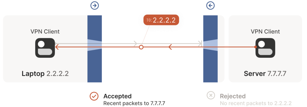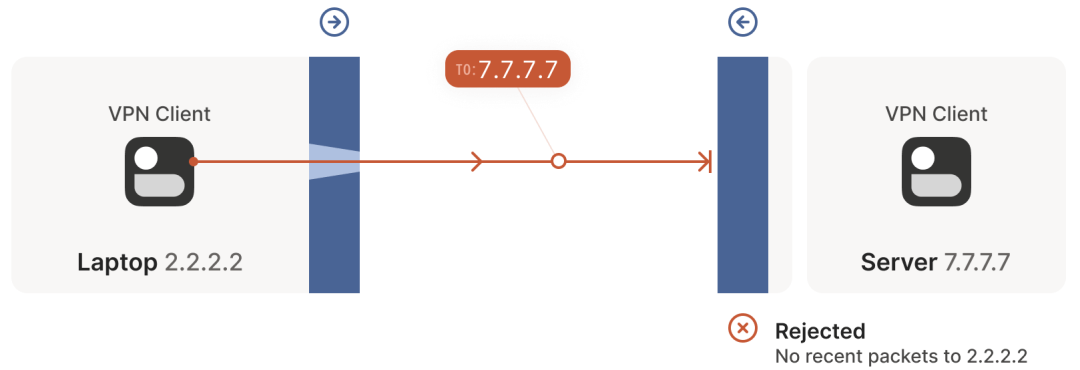 对方的防火墙会将这个包拦截掉,因为它没有 7.7.7.7:5678 -> 2.2.2.2:1234 的流量记录。但另一方面,Windows Defender 此时已经记录了出向连接,因此会允许 7.7.7.7:5678 -> 2.2.2.2:1234 的应答包进来。