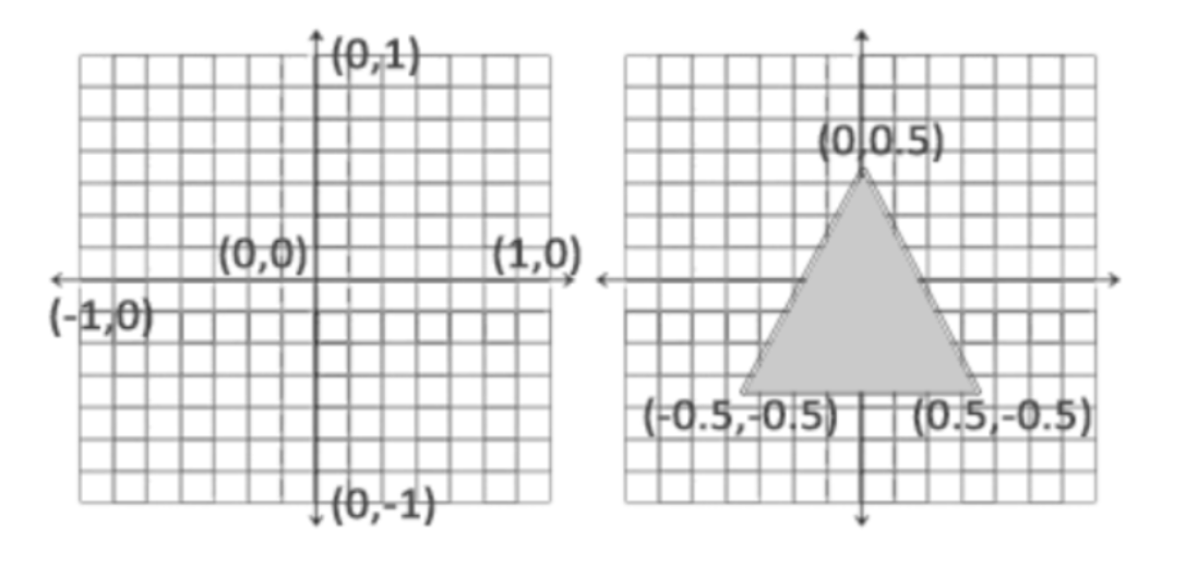 OpenGL不是简单地把所有的3D坐标变换为屏幕上的2D像素:仅当3D坐标在3个轴(x、y和z)上都为-1.0到1.0的范围内时才处理它,而所有在所谓的标准化设备坐标(Normalized Device Coordinates)范围内的坐标才会最终呈现在屏幕上