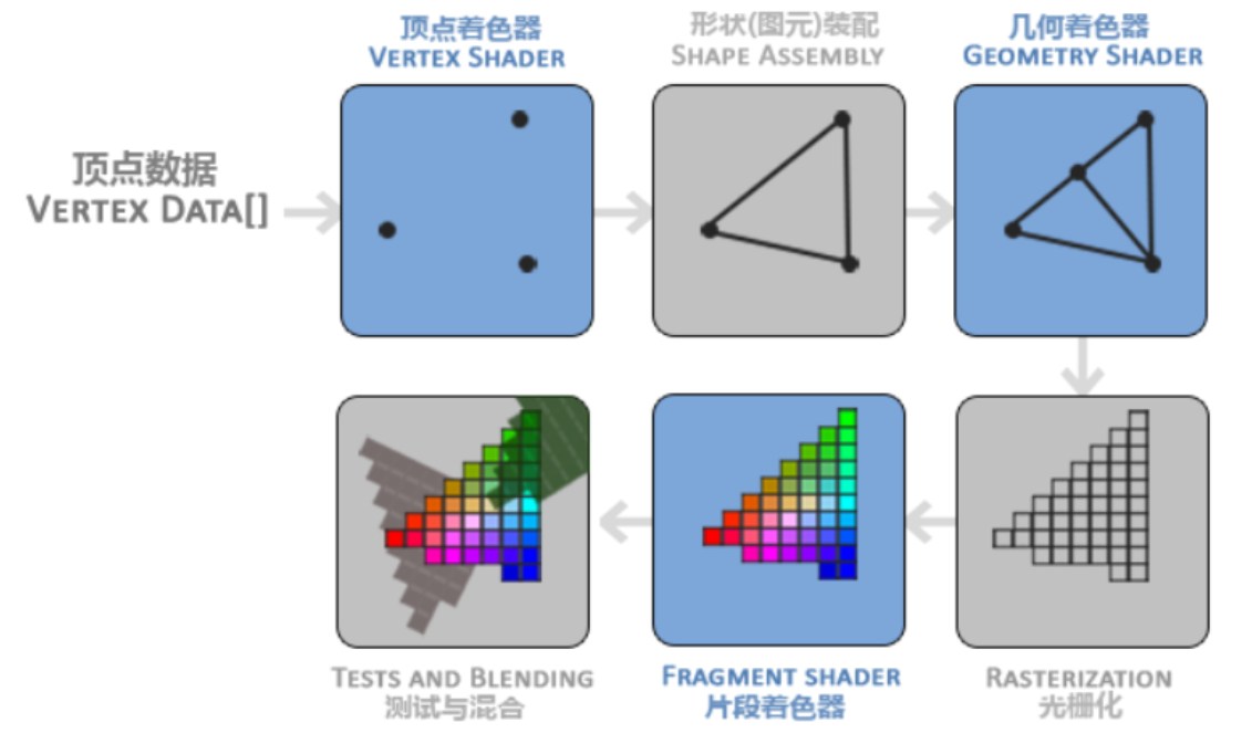 下面是一个图形渲染管线的每个阶段的抽象展示,蓝色的是我们可以注入自定义的着色器的部分