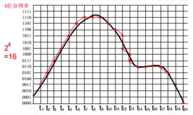 其中,黑色曲线表示要采集的声音波形,红色曲线表示采样量化后的PCM数据波形。上图中,采样位数是4 bit,每个红点对应一个Pcm采样数据,很明显: