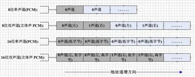 - 声道数:记录声音时,如果每次生成一个声波数据,称为单声道;每次生成两个声波数据,称为双声道(立体声)。单声道的声音只能使用一个喇叭发声,双声道的PCM可以使两个喇叭同时发声(一般左右声道有分工),更能感受到空间效果。