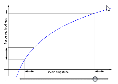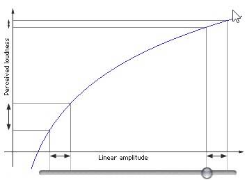 上述左图中,音量滑块位置与声音振幅为线性增长关系,右图是我们人耳感受的音量大小与滑块位置关系。可知,在左侧移动相同距离的滑块,感知到的声音变化范围很大,在右侧接近声音最大值移动相同距离滑块,感知到的声音大小变化就很小了。