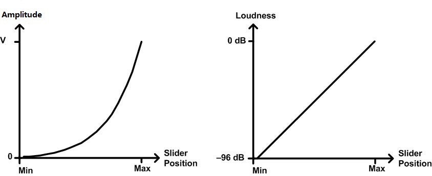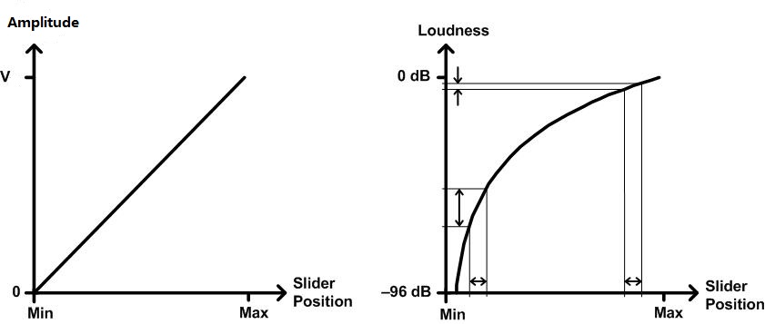 左图中,音量滑块位置与声音振幅对数关系增长。右图中无论哪个位置,移动相同距离滑块,感知到的声音变化都是相同的。