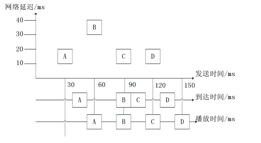 通过处理,A、B、C、D 的播放间隔一致,播放端就听感就会感受到延迟,但不会有卡顿。