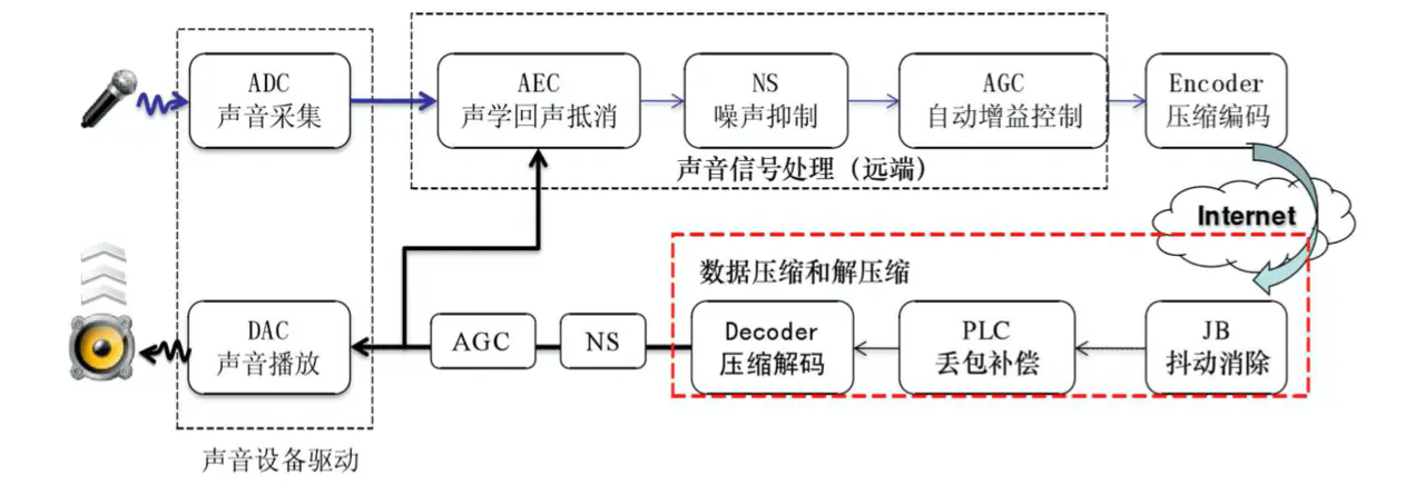 而从声音的处理流程中,NetEQ 在接受端靠前位置,用于处理收到的网络数据包,并传输给下面的具体的音频处理算法。