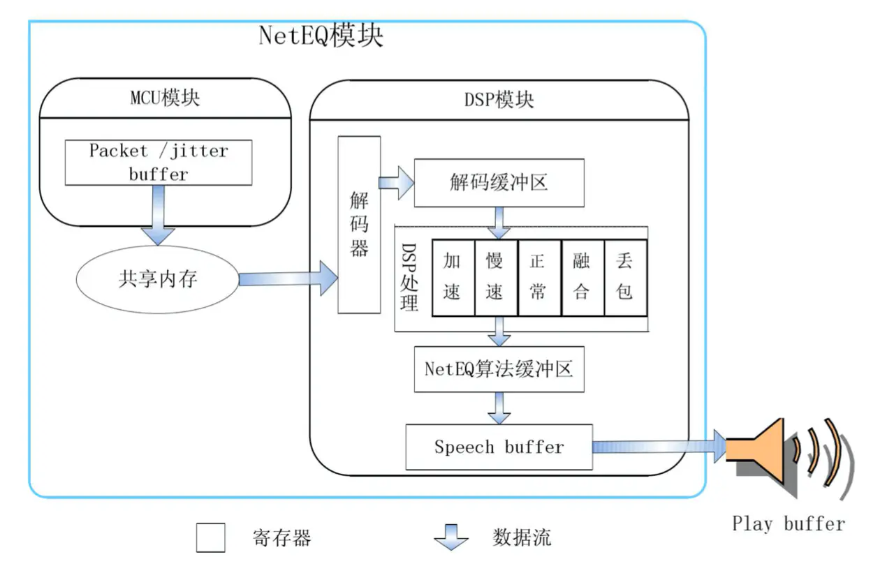 在 NetEQ 模块中,又被大致分为 MCU(Micro Control Unit,微控单元) 模块和 DSP 模块。MCU主要负责做延时及抖动的计算统计,并生成对应的控制命令。而 DSP 模块负责接收并根据 MCU 的控制命令进行对应的数据包处理,并传输给下一个环节。