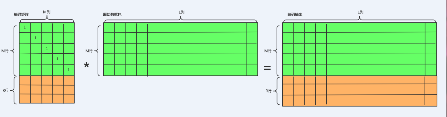 假设我们有个M个数据包,想要得到N个冗余包,一次异或计算只能得到一个冗余包,无法实现。如果直接用编码矩阵(M+N)*矩阵M,就可以得到一个M+N行的编码输出矩阵,其中L为原始数据包的长度。