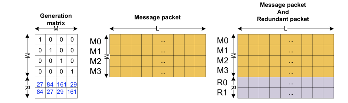 - 生成冗余数据:将M个原始数据包与生成矩阵做伽罗华域上的矩阵运算,即可得到N个冗余包。