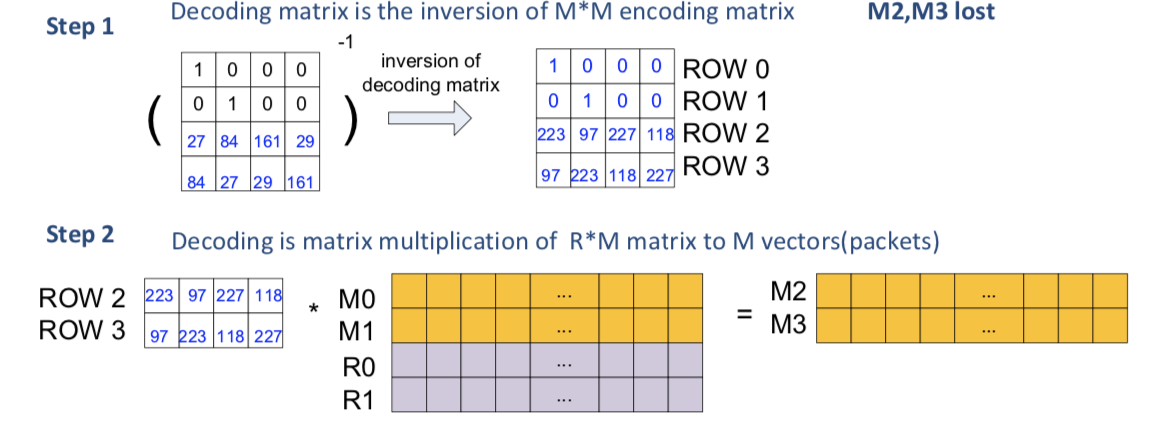 - 数据包恢复:选取收到的数据包以及冗余数据与恢复矩阵进行伽罗华域上的矩阵运算,求解出丢失的数据包。