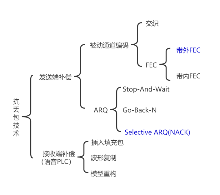 实时音视频类应用需要保证数据传输的可靠性,需要应用自身实现抗丢包、抗抖动、抗拥塞算法。本文重点介绍抗丢包技术,下图为业界主要的抗丢包技术。