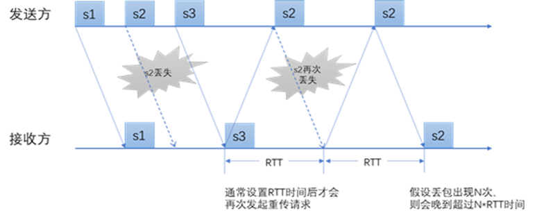 接收方在检测到数据包s2丢失后,会向发送方请求s2,等待1倍RTT时间后才会再次发起s2的重传请求。数据包的请求次数不会无限制持续发送,会有一个上限配置,这样做也会有以下几个问题。