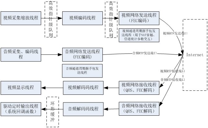 在视频采集缩放线程与视频编码线程之间,我们采用高效的双队列机制(队列元素为指针,进出队列无数据拷贝),如果视频编码性能非常充足的情况下,我们也可以将二者合并为一个线程。编码线程与网络发送线程分离,避免网络拥塞影响编码线程(这个对于UDP来说不成立,但对于RTMP这类TCP系统来说,网络收发线程与音视频编解码线程的分离是必须的,因为网络的抖动将影响音视频处理环节。站在系统设计的角度,我们为UDP和TCP统一使用上述架构)。