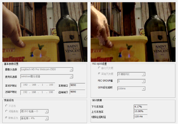 当使用4%随机丢包时,若关闭发端FEC功能,接收端视频将出现经常性花屏,声音出现丢失断续。若使用20%冗余度,视频花屏概率将大幅降低(不会完全消除,因为丢包是随机的,短时间内可能出现连续大量丢包的情况,超过20%冗余度的无失真抗丢包率是16.67%即会出现花屏)