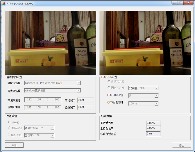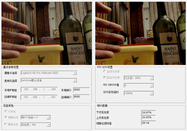 测试工具为点对点工作模式,可在两台PC上各自运行(同时也支持单机模式,只需将收发IP地址均设置为本地IP即可),以实现双方之间RTP(FEC+QOS)通讯。
