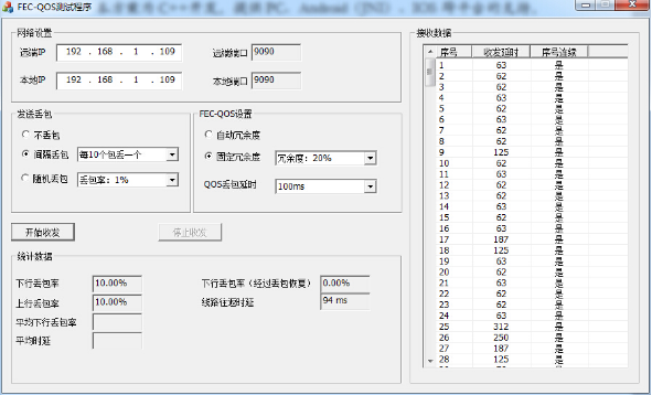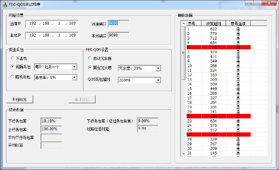 软件收发自定义的测试包数据,提供了模拟丢包功能,支持按固定间隔丢包或者按随机比率丢包;支持设置FEC冗余度或者选择冗余度自适应,支持设置QOS丢包等待时延等参数。