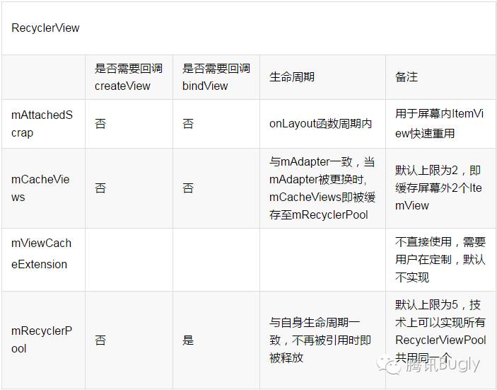Bugly之前也发过一篇相关文章,讲解了 RecyclerView 与 ListView 在缓存机制上的一些区别: