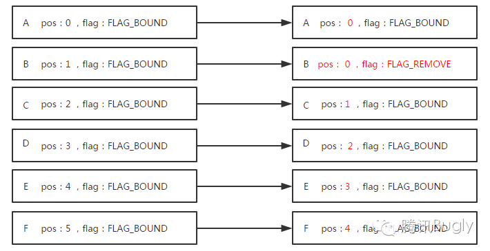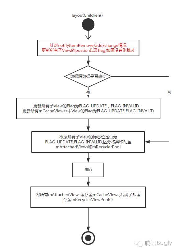 </a></p> RecyclerView是谷歌官方出的一个用于大量数据展示的新控件,可以用来代替传统的ListView,更加强大和灵活。 最近,自己负责的业务,也遇到这样的一个问题,关于是否要将ListView替换为RecyclerView? 秉承着实事求是的作风,弄清楚RecyclerView是否有足够的吸引力替换掉ListView,我从性能这一角度出发,研究RecyclerView和ListView二者的缓存机制,并得到了一些较有益的”结论”,待我慢慢道来。 同时也希望能通过本文,让大家快速了解RecyclerView与ListView在缓存机制上的一些区别,在使用上也更加得心应手吧。 PS:相关知识: ListView与RecyclerView缓存机制原理大致相似,如下图所示: 过程中,离屏的ItemView即被回收至缓存,入屏的ItemView则会优先从缓存中获取,只是ListView与RecyclerView的实现细节有差异.(这只是缓存使用的其中一个场景,还有如刷新等) PPS:本文不贴出详细代码,结合源码食用更佳! 2.1 缓存机制对比 1. 层级不同: RecyclerView比ListView多两级缓存,支持多个离ItemView缓存,支持开发者自定义缓存处理逻辑,支持所有RecyclerView共用同一个RecyclerViewPool(缓存池)。 具体来说: ListView(两级缓存): RecyclerView(四级缓存): ListView和RecyclerView缓存机制基本一致: 1). mActiveViews和mAttachedScrap功能相似,意义在于快速重用屏幕上可见的列表项ItemView,而不需要重新createView和bindView; 2). mScrapView和mCachedViews + mReyclerViewPool功能相似,意义在于缓存离开屏幕的ItemView,目的是让即将进入屏幕的ItemView重用. 3). RecyclerView的优势在于a.mCacheViews的使用,可以做到屏幕外的列表项ItemView进入屏幕内时也无须bindView快速重用;b.mRecyclerPool可以供多个RecyclerView共同使用,在特定场景下,如viewpaper+多个列表页下有优势.客观来说,RecyclerView在特定场景下对ListView的缓存机制做了补强和完善。 2. 缓存不同: 1). RecyclerView缓存RecyclerView.ViewHolder,抽象可理解为: View + ViewHolder(避免每次createView时调用findViewById) + flag(标识状态); 2). ListView缓存View。 缓存不同,二者在缓存的使用上也略有差别,具体来说: ListView获取缓存的流程: RecyclerView获取缓存的流程: 1). RecyclerView中mCacheViews(屏幕外)获取缓存时,是通过匹配pos获取目标位置的缓存,这样做的好处是,当数据源数据不变的情况下,无须重新bindView: 而同样是离屏缓存,ListView从mScrapViews根据pos获取相应的缓存,但是并没有直接使用,而是重新getView(即必定会重新bindView),相关代码如下: 2). ListView中通过pos获取的是view,即pos→view; RecyclerView中通过pos获取的是viewholder,即pos → (view,viewHolder,flag); 从流程图中可以看出,标志flag的作用是判断view是否需要重新bindView,这也是RecyclerView实现局部刷新的一个核心. 2.2 局部刷新 由上文可知,RecyclerView的缓存机制确实更加完善,但还不算质的变化,RecyclerView更大的亮点在于提供了局部刷新的接口,通过局部刷新,就能避免调用许多无用的bindView. (RecyclerView和ListView添加,移除Item效果对比) 结合RecyclerView的缓存机制,看看局部刷新是如何实现的: 以RecyclerView中notifyItemRemoved(1)为例,最终会调用requestLayout(),使整个RecyclerView重新绘制,过程为: onMeasure()→onLayout()→onDraw() 其中,onLayout()为重点,分为三步: dispathLayoutStep1():记录RecyclerView刷新前列表项ItemView的各种信息,如Top,Left,Bottom,Right,用于动画的相关计算; dispathLayoutStep2():真正测量布局大小,位置,核心函数为layoutChildren(); dispathLayoutStep3():计算布局前后各个ItemView的状态,如Remove,Add,Move,Update等,如有必要执行相应的动画. 其中,layoutChildren()流程图: 当调用notifyItemRemoved时,会对屏幕内ItemView做预处理,修改ItemView相应的pos以及flag(流程图中红色部分): 当调用fill()中RecyclerView.getViewForPosition(pos)时,RecyclerView通过对pos和flag的预处理,使得bindview只调用一次. 需要指出,ListView和RecyclerView最大的区别在于数据源改变时的缓存的处理逻辑,ListView是”一锅端”,将所有的mActiveViews都移入了二级缓存mScrapViews,而RecyclerView则是更加灵活地对每个View修改标志位,区分是否重新bindView。 文章的开头便抛出了这样一个问题,微信Android客户端卡券模块,大部分UI都是以列表页的形式展示,实现方式为ListView,是否有必要将其替换成RecyclerView呢? 答案是否定的,从性能上看,RecyclerView并没有带来显著的提升,不需要频繁更新,暂不支持用动画,意味着RecyclerView优势也不太明显,没有太大的吸引力,ListView已经能很好地满足业务需求。 进一步来讲,结论是: 列表页展示界面,需要支持动画,或者频繁更新,局部刷新,建议使用RecyclerView,更加强大完善,易扩展;其它情况(如微信卡包列表页)两者都OK,但ListView在使用上会更加方便,快捷。 Ps:仅从一个角度做了对比,盲人摸象, 有误跪求指正。 1. ListView a. Android-23源码 b. [Android ListView工作原理解析,带你从源码的角度彻底理解]