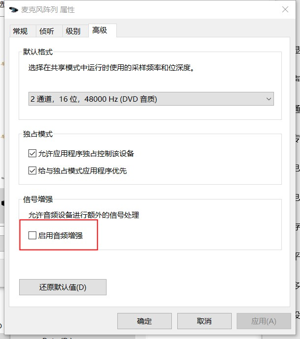 当前很多 Windows 设备会在屏幕顶端内置麦克风阵列,提供音频增强功能,开启方式如下图。这个功能默认屏幕正前方夹角区域为拾音区域,通过麦克风阵列技术可以有效的增强拾音区域内发言人语音,“隔离” 拾音区域以外的 “噪声”,其主要的弊端就在于开启此功能后仅支持 8k 频谱,且各厂家增强算法存在差异,效果也参差不齐。因此,软件需要具备能够 bypass 硬件自带音频增强功能的能力,为高音质做保障。