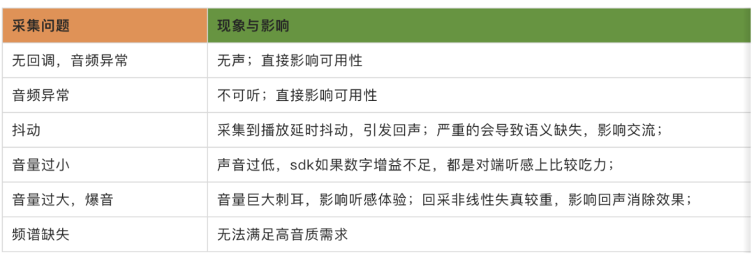 - 由于硬件厂商的不同,不同端的音频采集解决方案参差不齐,因此采集到的音频质量的好坏直接影响着 3A 算法拿到的生产资料的可用性,同时也决定这最终用户接收到音频信号质量的上限。根据实际工作中遇到的音频问题,因为设备采集引起的问题基本可以归纳为如下几类: