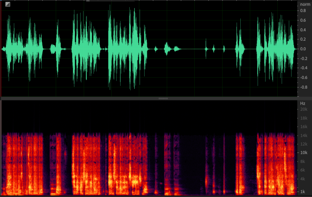 采集异常主要体现在频谱 “模糊”,严重的会导致无法听懂语义,影响正常交流。如下语谱图。