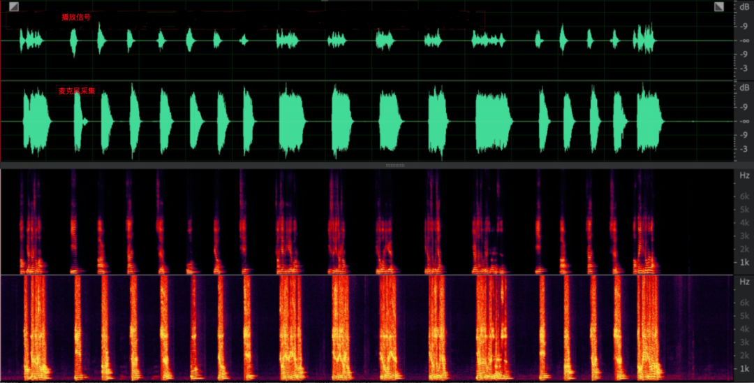 另外,采集异常后,播放的信号被麦克风采集后也会表现出异常,从而引起严重的非线性失真,影响回声消除效果,如下图。
