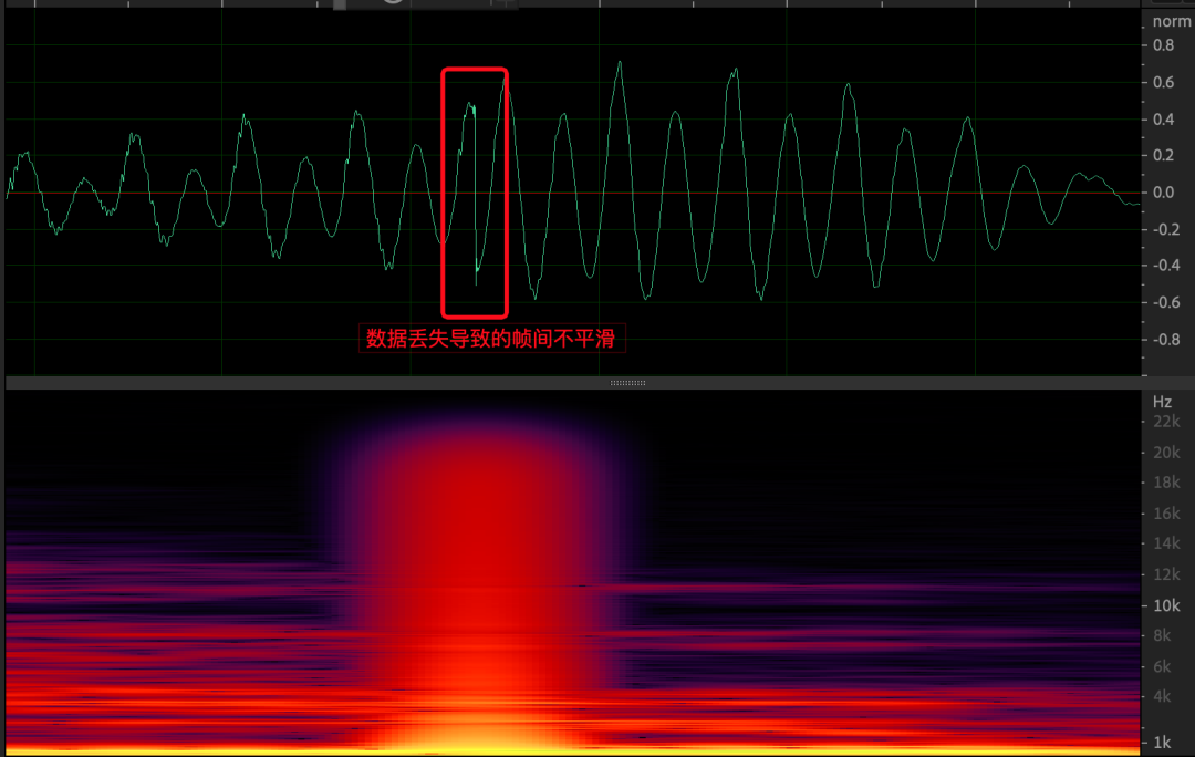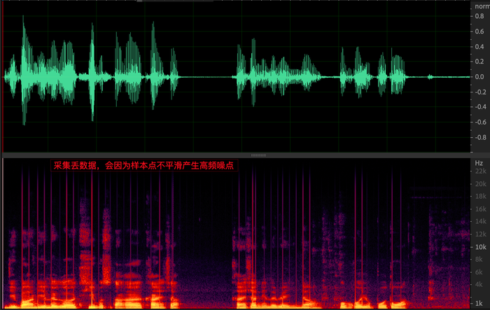 常见的就是采集丢数据,听感上会听到有很多高频噪点(下图为上图中噪点放大后的局部图),严重的会影响 AEC 算法中对延时估计准确性和远近端非因果问题,严重的会导致漏回声。
