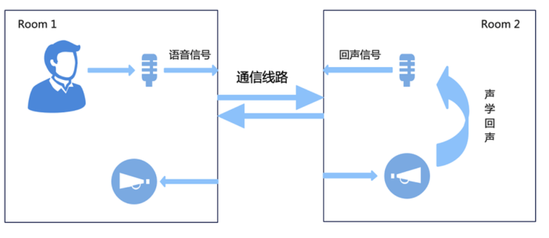 - 原理:如下图所示,Room1的用户讲话,通过rtc到对端Room2,经过对端的扬声器播放后被对端的mic采集进来后,再次编码传输到Room1 ,从而Room1可以听到自己的声音,也就是所谓的“回声”,AEC要解决的问题,就是消除回声信号,从而避免对端听到自己的声音;所以,在音视频通信中,常见的问题,“我能听到我的声音”的问题原因,并不是“我”的手机端出了问题,而是与“我”通信的其他人回声消除没有处理好,从而导致“我听到了我自己的声音”。