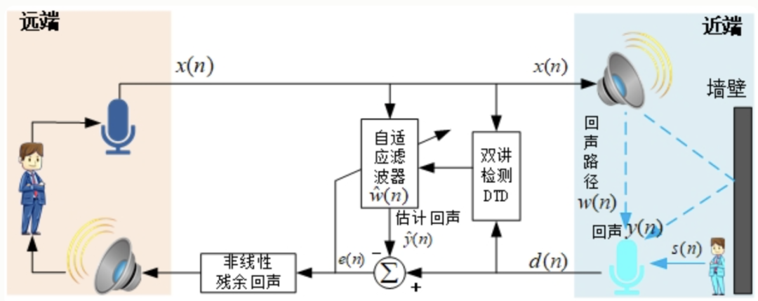 回声消除的基本原理,就是利用近端信号(mic)采集到的包含回声的信号,和远端参考信号(接收到的播放前的对端语音信号)之间的相关性,根据扬声器信号与其产生回声信号相关性为基础,建立远端信号模型,模拟回声路径,通过自适应算法调整,使其冲击响应和真实回声路径相逼近。然后将麦克风接收到的信号减去估计值,即可实现回声消除功能。