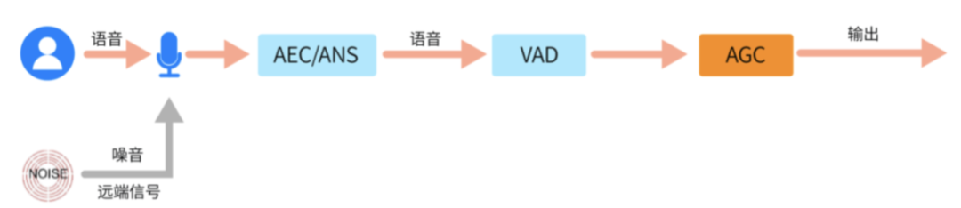 - 并不是所有信号都要进行音量增益控制的,和 ANS/AEC 只抑制噪声/远端回声、要保留近端语音一样,AGC 也要针对采集信号中的近端语音做甄别,避免对噪声、回声等无关信号的增益。考虑这点,把 AGC 模块放在 AEC、ANS 处理之后就比较合适,因为此时信号中的噪声和回声已经被极大的削减。但位置的“优势”,不代表 AGC 就可以毫无顾虑的开展工作。为避免漏网之鱼,往往需要进行人声检测(VAD),进一步区分语音段和无话段。